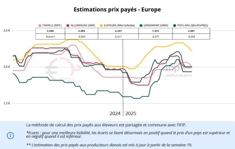 La période est relativement calme en termes de volume d’abattage, ce qui reste normal pour la saison. Les chiffres de 2025 restent supérieurs à ceux de 2024, même avec une zone UNIPORC désormais élargie. Les poids d’abattage ont de nouveau progressé cette semaine et rejoignent les niveaux de 2024. Désormais, les fortes chaleurs de début juillet ne semblent plus avoir d'impact sur le poids.