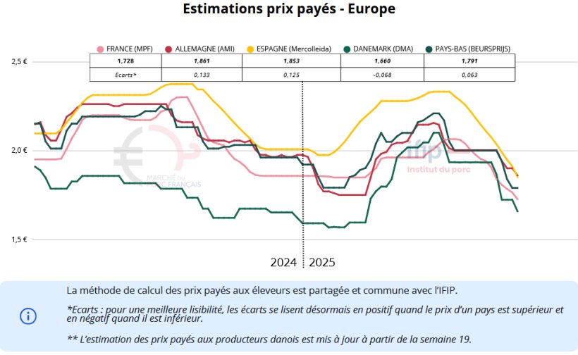 En Allemagne, la pression s’est accentuée la semaine dernière. La réduction du nombre d’abattages hebdomadaires entraîne un excédent croissant de porcs, notamment dans le nord-ouest du pays. Le sud présente un équilibre un peu meilleur, mais les disponibilités y restent également supérieures aux besoins. Il en résulte une hausse du poids moyen des animaux abattus, en progression de 200 g sur une semaine. Le marché de la viande ne donne toujours pas de signaux positifs. Les abattoirs agissent avec prudence, ne souhaitant pas stocker ou congeler de la viande à des prix jugés trop élevés. Si certains estimaient qu’il fallait limiter la baisse du prix directeur à 10 centimes, c’est finalement une baisse de 15 centimes qui est avancée.