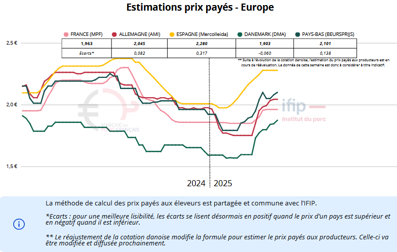 Le marché espagnol reste équilibré, avec une légère orientation haussière, mais la prudence a conduit au maintien des prix. Les importations françaises restent soutenues, bien qu’à des niveaux de prix plus bas. Les poids ont progressé pour la deuxième semaine consécutive, atteignant 95,5 kg, soit un kilo de plus que l’an dernier. Ces niveaux élevés compliquent la commercialisation, mais les abattoirs évitent de pénaliser les excès afin de ne pas fragiliser l’approvisionnement. L’exportation progresse, à l’exception de la Chine, où les espoirs liés au conflit tarifaire avec les USA ne se concrétisent pas encore. Sur le marché intérieur, la viande reste stable.