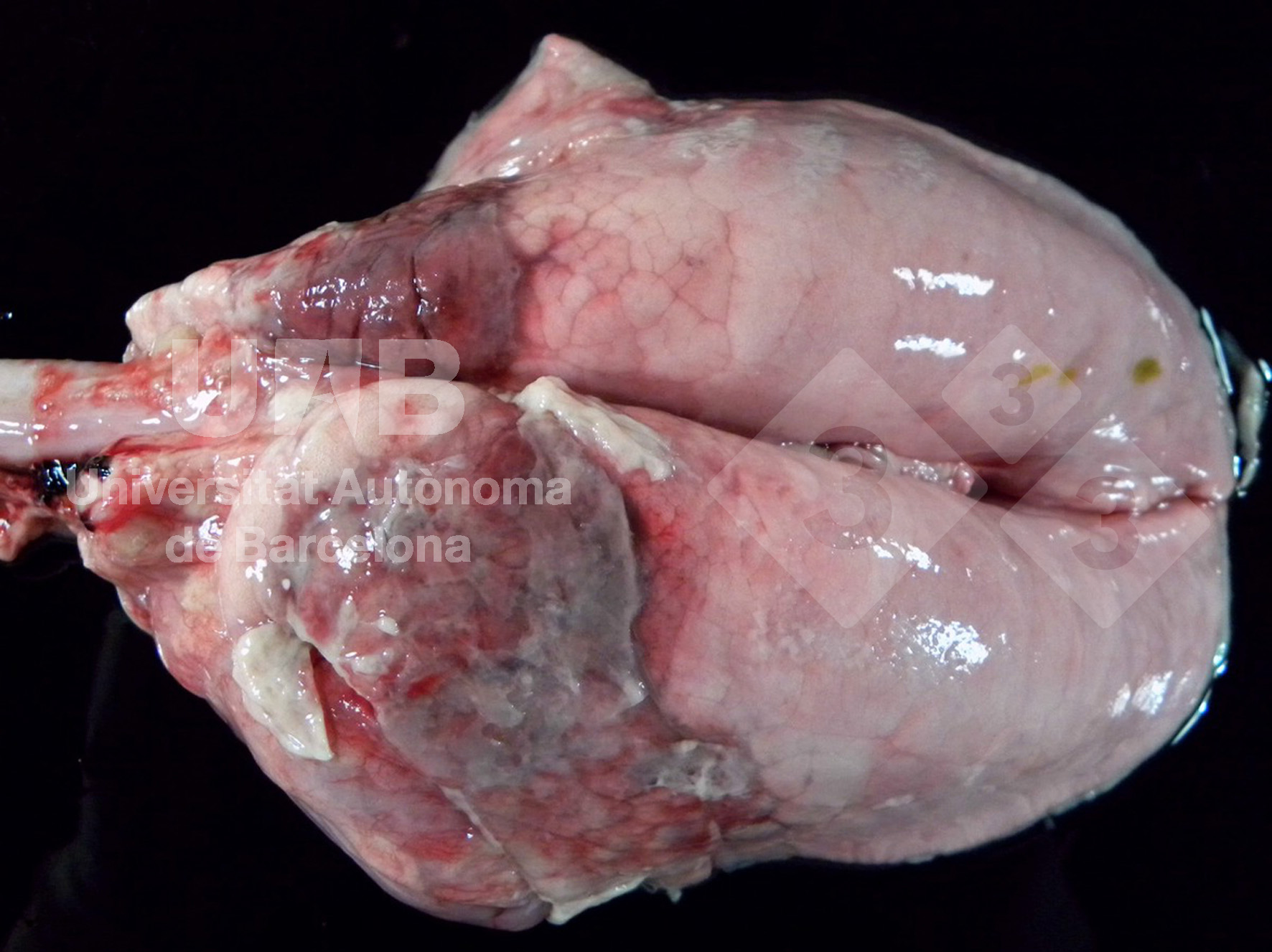 La bronchopneumonie fibrineuse cranioventrale (pleuropneumonie) chez les porcelets allaitants est généralement associée à des infections par Bordetella bronchiseptica. Haemophilus parasuis. Elle produit une pleurésie mais pas de bronchopneumonie à différents âges. En revanche, , Actinobacillus pleuropneumoniae (App) provoque des lésions fibrineuses hémorragiques nécrosantes sur les poumons de porcs en croissance et en engraissement mais pas chez les porcelets allaitants. De plus, les lésions associées à App ont en générale une localisation caudodorsale.