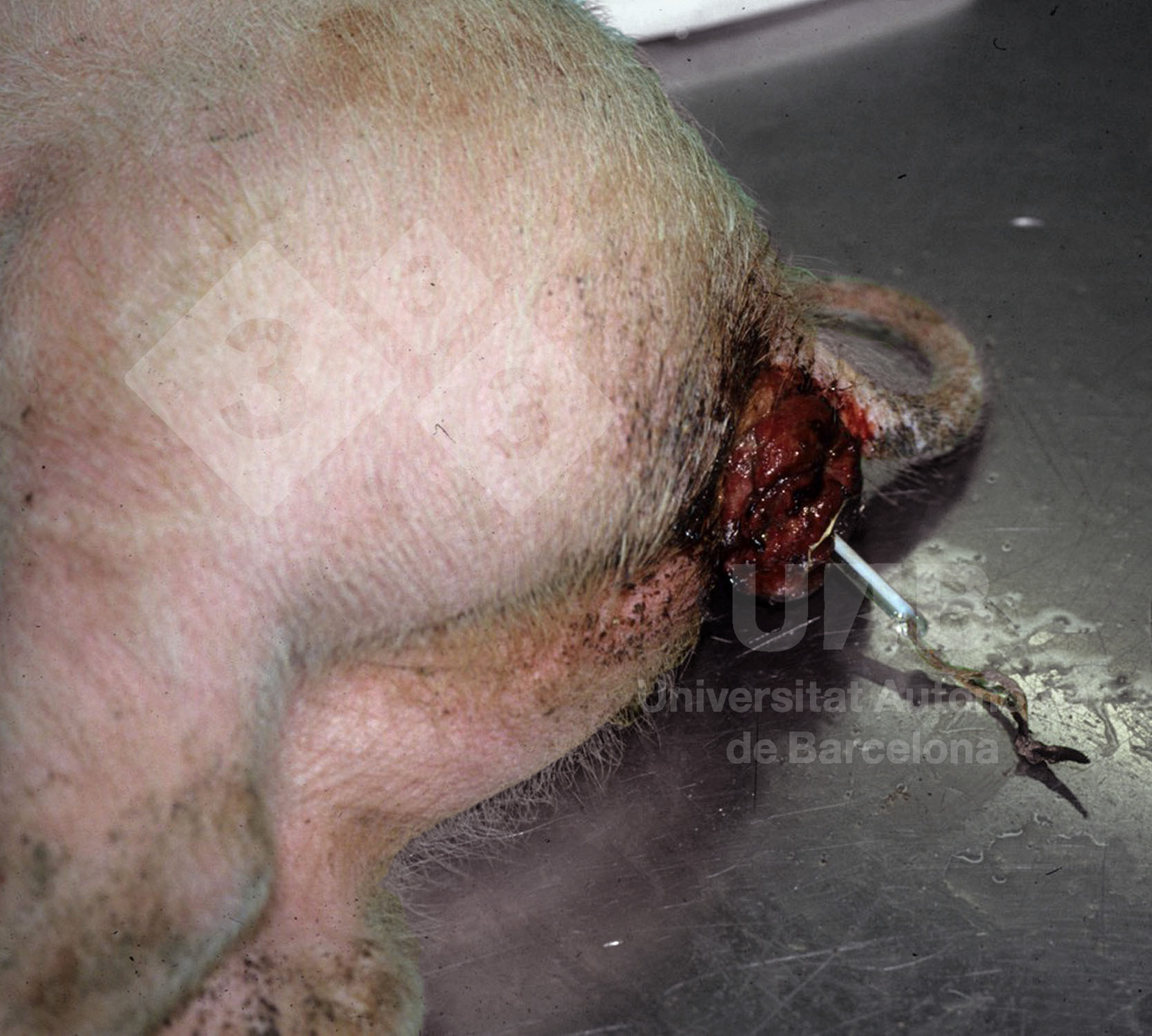 La dysenterie porcine est causée par l’infection du Brachyspira hyodysenteriae. Cette bactérie provoque une sévère colite muqueuse ulcéreuse. L’inflammation et l’œdème du côlon et du rectum peuvent être si graves qu’ils parviennent à produire du ténesme et, par conséquent, un prolapsus rectal. Toutefois, cette lésion peut aussi avoir d'autres causes, telles que les parasitoses, des changements alimentaires, la gestation, des dommages physiques et des facteurs génétiques.