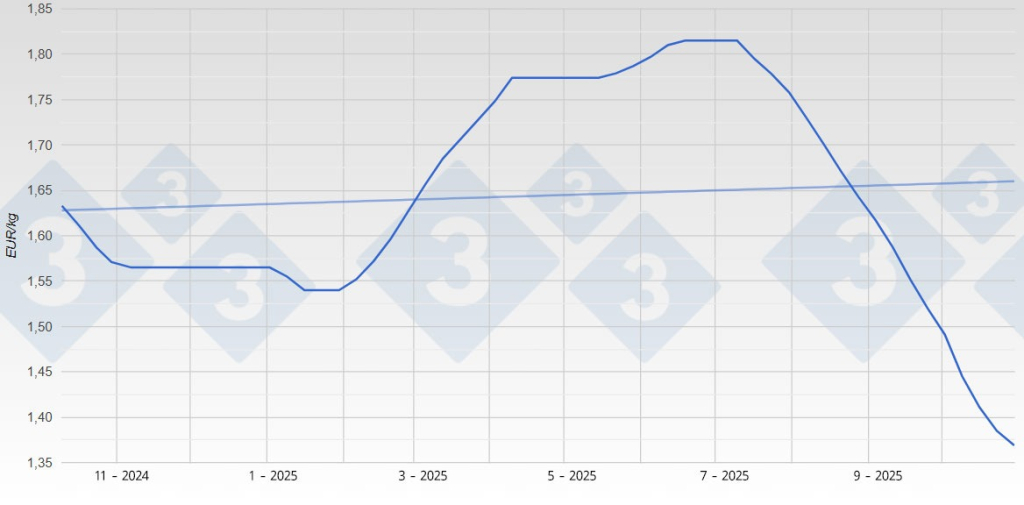 Cela fait trois mois consécutifs de baisse en Espagne, ce qui représente une diminution de 14 %, malgré laquelle l’Espagne continue de dominer les prix du porc dans l’UE. L’incertitude réside dans la question de savoir jusqu’où se poursuivront ces baisses.