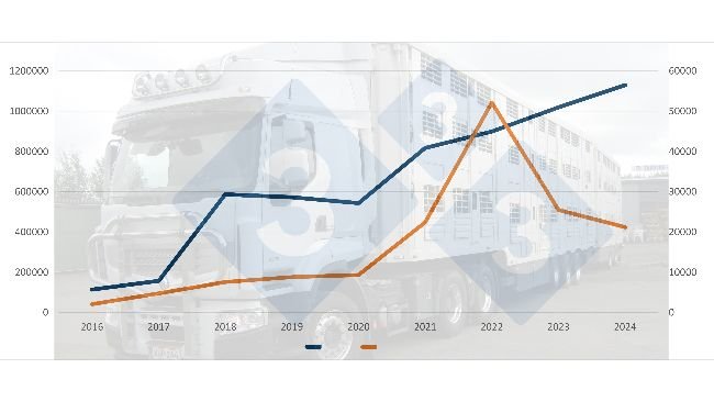 D’un autre côté, les importations de porcs ont été plus volatiles. Bien qu’en 2016 seulement 2 040 porcs aient été importés, ce chiffre a fortement augmenté en 2020 pour atteindre 50 042 porcs. Le plus grand pic a été observé en 2022 avec 94 217 porcs importés. Cependant, les importations ont chuté à 30 032 en 2023 avant de rebondir en 2024 avec 39 589 porcs importés, soit une hausse de 32 % par rapport à 2023.